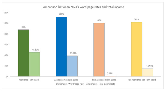 To better understand the correlations, we then calculated the scores for word count per page for the different annual reports. Next, we compared and rated them according to the total words per page. Therefore, if an annual report scored above the total word/page rating, it received a score above 100, and if not, below 100. We also compared the organisations by income and total income. Expressed as a share of total income, accredited faith-based NGOs received the most funding (45.6%), followed by accredited non-faith-based NGOs (39.1%), non-accredited non-faith-based NGOs (14.5%), and non-accredited faith-based NGOs (0.8%) (Figure 2). Interestingly, the NGOs with the highest income, accredited faith-based NGOs, had the lowest score in words per page (88%); this result suggests that these organisations used more graphic illustrations or images in their annual reporting while, at the same time, publishing reports with the most pages overall (Figure 1). The accredited non-faith-based NGOs had the highest score in terms of words per page (112%) and the second-highest share of income (Figure 2).