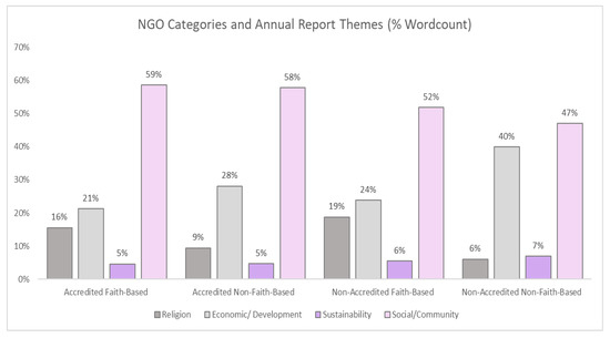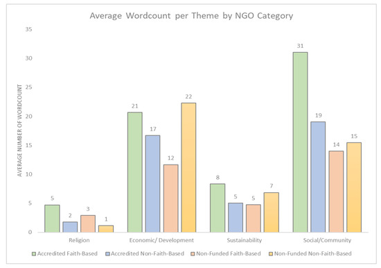 We also compared the profiles of the different NGOs by categories (Religion, Economic/Development, Sustainability, Social/Community) relative to their annual report word count (Figure 3). Significant differences were found between the themes for each NGO category: