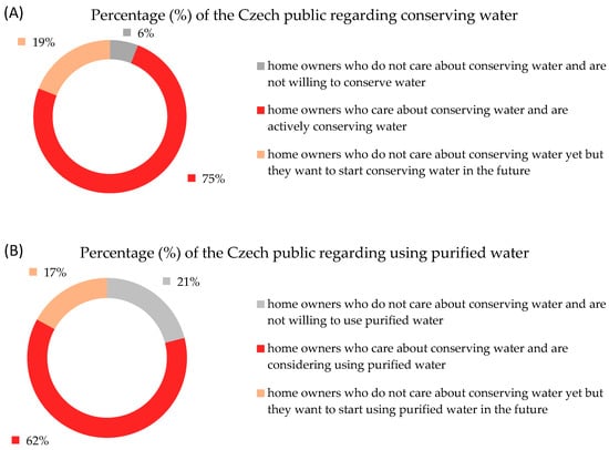 Distribution of the public regarding their willingness to conserve water in households (A) and use purified water in households (B). The data were collected in Czechia in April–May 2021 using questionnaire surveys (1824 respondents).