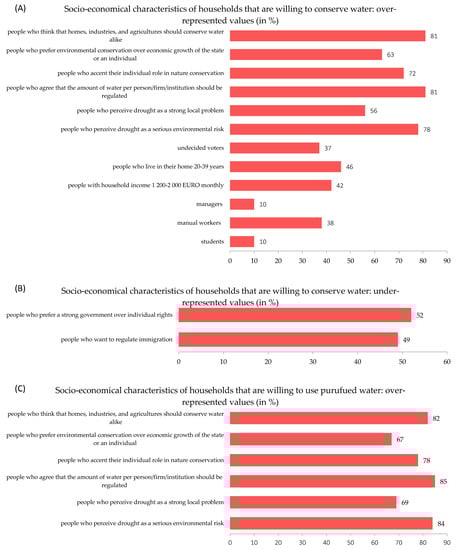 The study showed that respondents who are willing to conserve water and use purified water make up a heterogeneous group. Their socio-economic characteristics are mostly like those of the rest of the public (Figure 3). The groups of people who are interested in conserving water and using purified water do not significantly differ from the public in gender, age, socio-economic status, occupation (type of job), or type of living (p > 0.05 for each factor). However, they can be distinguished from the public by being more pro-environment and by accepting their personal role in nature conservation.