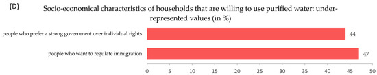 Socio-economic characteristics that separate water-conserving homeowners from the rest of the public. The graphs (A,B) show which socio-economical characteristics are significantly more and less represented, respectively, in water-conserving household owners in comparison to the public. The graphs (C,D) show which socio-economical characteristics are significantly more and less represented, respectively, in households willing to use purified water in comparison to the public. The number behind each column represents the percentage of households that fit the description. The data were collected in Czechia in April–May 2021 using questionnaire surveys (1824 respondents).