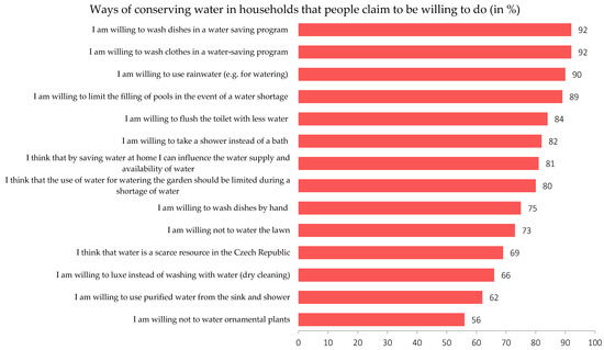 The main activities that household owners claim that they are willing to do to conserve water. The number behind each column represents how many respondents agreed with the statement (in %). The data were collected in Czechia in April–May 2021 using questionnaire surveys (1824 respondents).