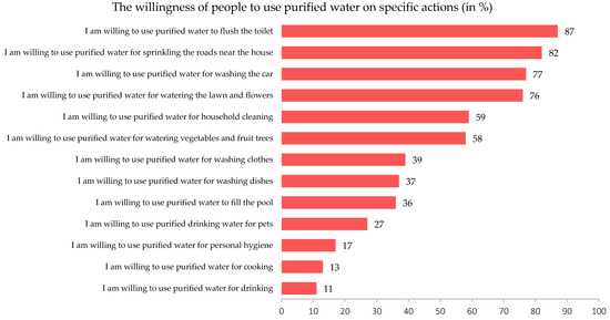 Similarly, the homeowners are mostly for using purified water, but they are only willing to use it for activities that are hygienically safe. They are very much willing to use purified water for flushing toilets, washing cars, cleaning rooms, and watering lawns. Conversely, they are not willing to use purified water for drinking, cooking, hygiene, or other activities that involve getting into contact with the water (Figure 5). They are also concerned about potential hygienic hazards of the purified water, e.g., residual smell, bacteria, and impurities (Figure 6). The most important factor that influenced the willingness to use purified water was hygiene (0.903), followed by comfort and practical usefulness (0.872). The most important factor that described why people do not want to use purified water was hygiene (0.854) followed by practical usefulness (0.816).