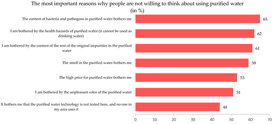 The main reasons why household owners claim to refuse to use purified water in their households. The number behind each column represents how many respondents agreed with the statement (in %). The data were collected in Czechia in April–May 2021 using questionnaire surveys (1824 respondents).