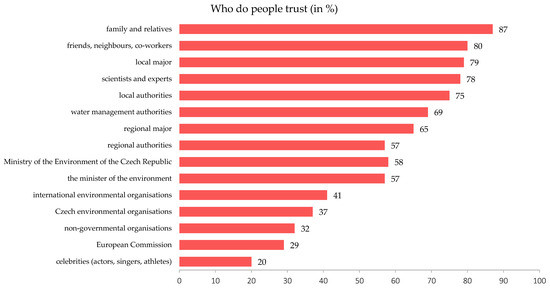 Level of trust that water-conserving household owners give to individual people and institutions. The number behind each column represents how many respondents trusted the subject (in %). The data were collected in Czechia in April–May 2021 using questionnaire surveys (1824 respondents).