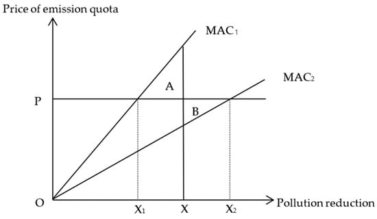 The market price of the emission quota can be deducted through trading, which is also applied in the case of the CTP. As shown in Figure 1, there are two polluters in an area: polluter 1 has a higher cutting cost and uses a steeper marginal cost-cutting curve, MAC1, while polluter 2 cuts pollution at a lower cost and uses the marginal cost-cutting curve MAC2, which is flatter. Assuming that the emission quotas are equally distributed to the two polluters, each polluter has to reduce OX units of pollution; the total reduction is 2OX, and the market equilibrium price of the emission quota is P. At this time, polluter 2 will find that the amount of XX2 pollution reduction will increase and the excess carbon emission quota will be sold at the price P, and the net income of area B will be obtained. Polluter 1 will find that it is beneficial to purchase the emission quota of XX1 at the price P and reduce their own pollution reduction amount, which can save the net cost of area A. In this way, in the entire market, both of the polluters will trade emissions rights from their own interests. The total reduction after trading is still 2OX, and the marginal cut cost for both polluters after trading is equal to the market price of the emission quota.