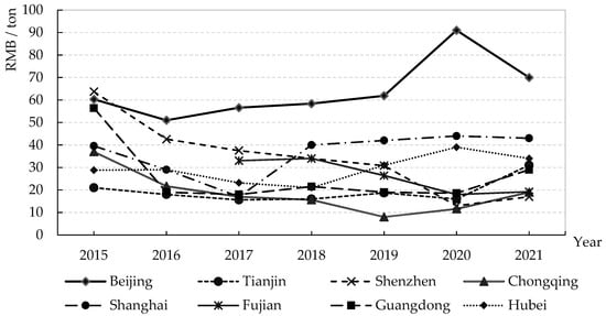 From the perspective of each pilot’s total transaction volume, as shown in Figure 4, the transactions in Beijing, Shenzhen, Shanghai, Hubei, and Guangdong were the most active. From 2014 to 2021, Hubei Province accounted for the largest share of the total transaction volume, as its market activity was higher. The other pilots were far lower than the Hubei pilot in terms of total transaction volume. The proportion of Beijing, Shenzhen, and Shanghai decreased in sequence. Fujian, Tianjin, and Chongqing accounted for no more than 5%, and the market activity was lower. The big differences in the transaction volume of the different pilots reflect the unbalanced and unstable development of the carbon emission trading markets; this means the carbon trading mechanism should be improved.