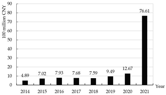 From the perspective of China’s carbon trading market turnover, Figure 3 shows that the trading scale was getting larger and larger. A unified national carbon emission trading market is in the progress of being constructed. On 16 July 2021, the national carbon market officially started online trading, covering about 4.5 billion tons of carbon dioxide emissions annually, making it the largest carbon market in the world. In the first performance cycle of the national carbon market (2019–2020), the cumulative turnover of carbon emission quotas was 179 million tons, with a cumulative turnover of CNY 7.661 billion, and the growth rate was still rising.