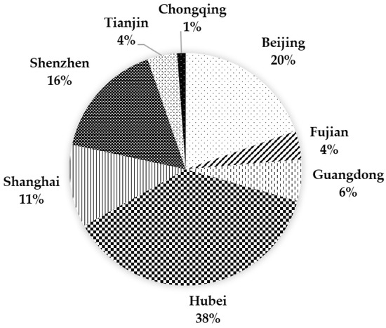 Proportion of total transactions of eight pilot carbon emission trading markets from 2014 to 2021 in China. Source: China Carbon Emissions Database (CEADs), http://www.ceads.net (accessed on 12 April 2022).