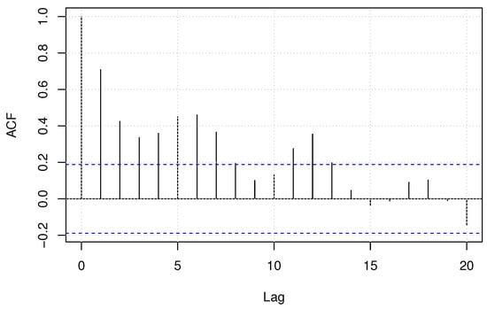 First, let us consider the possible internal correlation in our data, meaning the correlation among samples in our time series. One way to approach this question is by using the autocorrelation function (). This function evaluates Pearson’s correlation coefficient for time series and a delayed (lagged) version of itself. The lag is the variable of . It follows trivially that because the correlation of identical datasets is maximum. In general, the value represents the correlations between moments in time series, i.e., in our case months, for samples shifted from each other. If the value differs from 0 significantly, then this documents a correlation between sample t and sample . This may also take into consideration possible influences between these two samples; it does not need to be a direct influence necessarily. A significant may partially indicate a certain level of seasonal impacts, as well as periods with certain trends. More formally, the is defined as