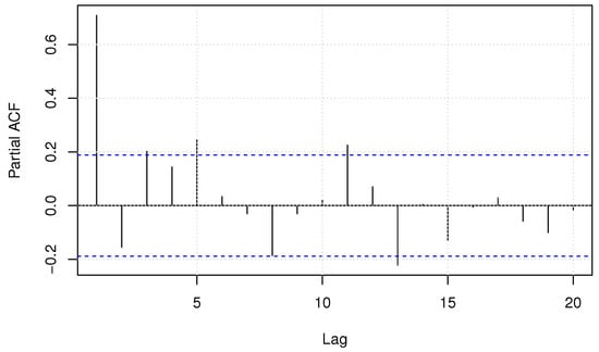 Figure 2 shows that a significant positive is present within a delay of 5 and 11. This confirms a certain level of seasonal impact, as indicated by the . If we compare these observations with our data, we can state that, in the summer, the number of visitors is smaller than in the spring and at the end of the year, where it seems that the data reach higher values (for 5–6 and 11–12, the monthly shifts have positive and ) [30]. It would be interesting to compare these expectations with the fault rates in the RING system, assuming that faults and defects will be tracked. This review also proposes that the system should undergo yearly maintenance, probably during the summer holiday months, and other repairs and maintenance could be concentrated in months such as May, November, and December.