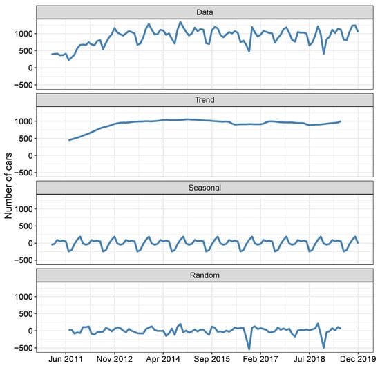Figure 3 depicts the data and their decompositions into trend, seasonal, and random (leftover) components.