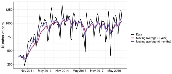 However, seasonal effects may be distorted by the trends of the time series and the tendencies for the growth/drop. We used the sliding average method to isolate this effect. The sliding average method takes a given time window and replaces the values of the samples with the arithmetic mean of the values in that time window. This is the basic form of sliding averages, but other replacement methods can be used, such as an exponentially weighted average (as we used in our case). Since we used 6- and 12-month sliding windows, we put more weight on more recent data, which is exactly the purpose of the exponential weighing (for details, see, e.g., [32]). The resulting values should be “smoothed out” and capture potential trends without random spikes and, hence, be more suitable for analysis than the unprocessed data.