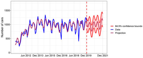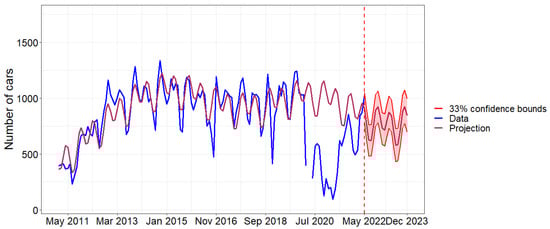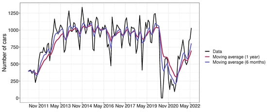 The resulting approximation and prediction are depicted in Figure 7. Estimating the rising prices for the utilization of APSs and expecting 12,000 cars by the end of the year 2023 resulted in a rather poor , which, coincidentally, results in approximately (recall ) a 67% chance of profit in the nearest future. As we can see, the pandemic affected the possibilities of APSs significantly. However, it is still not a desperate estimate and the trends from both predictions and moving averages suggest that, shortly, the utilization rate could return to pre-pandemic levels. Note that according to additional data from the practitioner, the utilization rate peaked at around 40% even before the pandemic. This shows that the system has not reached its full potential yet.