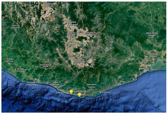 ©2022 Google Earth. Location of the study area. Satellite photo over Oaxaca, México, pointing to the location of La Escobilla (left yellow point) and La Ventanilla (right yellow point) [23].