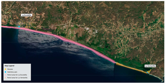 Map of urban distribution and patrolling area of La Ventanilla and La Escobilla [24] (Background image from ©2023 Google Earth).