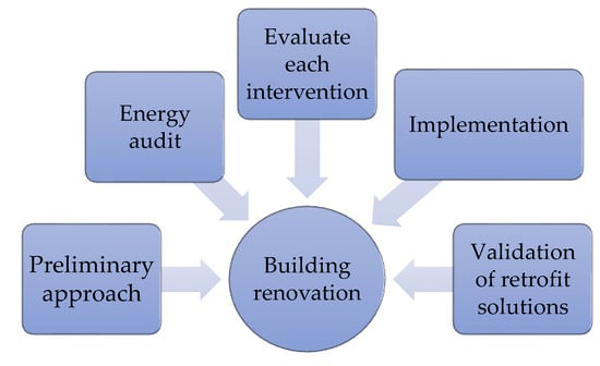 A first assumption would be to realize that demolishing an existing building and replacing it with a new energy-efficient building is not a sustainable practice []. Thus, the optimization procedure we propose here consists first in selecting, simulating and evaluating the most efficient interventions in terms of energy costs, while minimizing the intrusion and interruption of the building operation. According to numerous in-depth studies on the key phases of building renovation [,,], and as shown in Figure 1, there are five stages of intervention in the renovation of an existing building. The first phase consists of a preliminary approach to the project. The second phase is the energy audit and in-situ data acquisition. The third phase is the evaluation of the potential of each intervention, while the fourth phase is dedicated to the implementation of the renovation solutions, which are finally validated by the results in the fifth phase [].