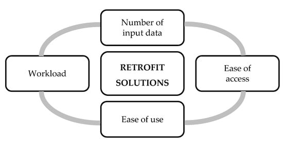 The last stage (see ➃ in Figure 2) of the proposed methodology is to assess the retrofit solutions that have been pre-identified. Proposing solutions that should harmonize cost effectively greener current materials to modern technology practices forms the basis for efficient methods for retrofitting older structures []. Multiple copies of buildings can be created in the software, representing model renovation scenarios for separate improvements or any combination of them. The following five criteria were used to decide on retrofit []: