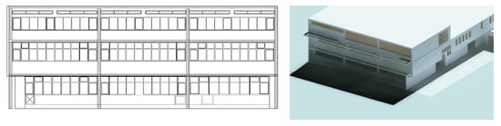 We have previously seen that daylight and shading play an important role in determining the thermal properties of building structures; especially for existing buildings where shape and volume modifications are not applicable. In order to visualize and design the shape of the building, a three-dimensional solid model was created using Autodesk’s AutoCAD application (educational version). As shown in Figure 8 and Figure 9, the model was to be sampled and represented the walls as solids with an additive operation. Each wall unit was extracted from the two-dimensional model and extruded, which allowed the actual height of the building facades to be measured. The openings were then represented by the void created after the extruded wall units were matched. The neighboring building was also modeled to demonstrate its shading on the opposite building facade.