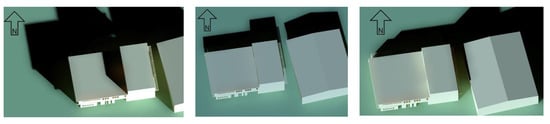 Subsequently, as indicated in ➂ of Figure 2, it is necessary to design the shape of the building and its particularities. In order to visually design the shape of the building and determine its “weak points” in terms of orientation, sun penetration and shading requirements, a three-dimensional model was created in AutoCAD software. This software was chosen because it is one of the most popular in the computer-aided design industry, where basic three-dimensional CAD skills are needed to quickly create a model for shading simulations. Geometric shapes and dimensions of the building envelope are applied, using basic software commands to create the building model. Neighboring buildings are also modeled to calculate their shading effect on the building under study. Once the geographical location is defined (latitude and longitude of the building location), sunlight simulations were performed for selected periods. Simulating the shading of the building facades can provide valuable information to determine the weakness of certain facades and help propose retrofit solutions in terms of building form and geometry. It should be noted that, according to [,,], building geometry is not considered important for the thermal performance of older structures, due to the potential application of newer, higher quality building fabrics with increased thermal insulation and reduced air leakage when applying retrofit solutions.