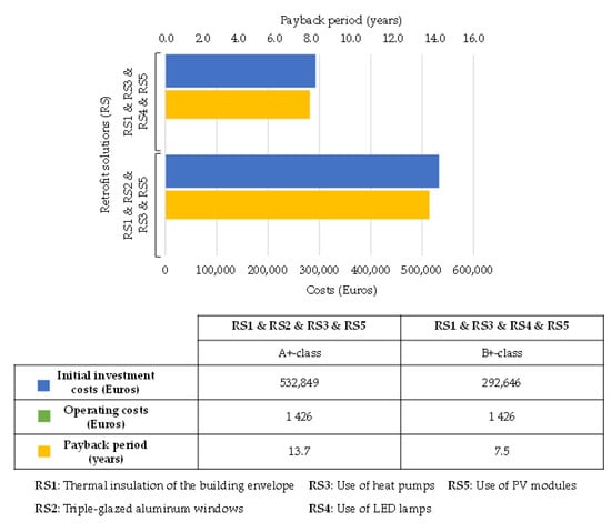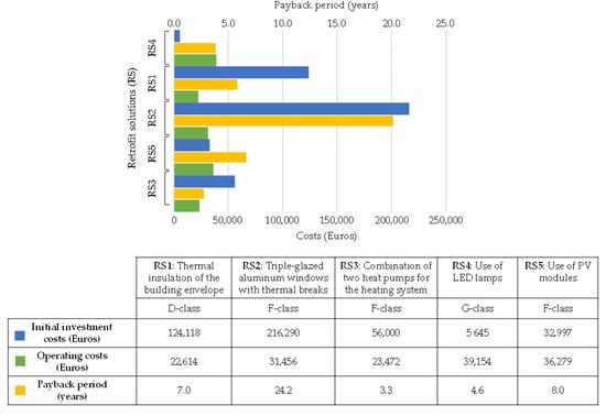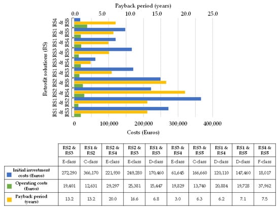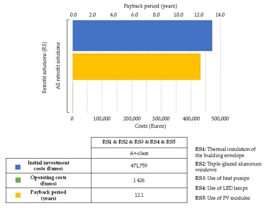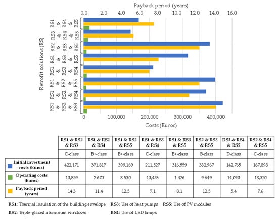 The proposed approach resulted in the selection of the following five retrofit solutions: (RS1) Thermal insulation of the building envelope; (RS2) Use of triple-glazed aluminum windows with thermal breaks; (RS3) Use of heat pumps for the heating system; (RS4) Use of LED lamps; and (RS5) Use of PV modules. The objective was not only to evaluate each solution individually, but also to combine them (two-by-two, three-by-three, four-by-four, and all) to optimize the building’s energy class, while minimizing costs (initial investment costs and operating costs) and payback period. The results of the simulation show that, among the individual renovation solutions, the RS1 solution achieves the best energy class of the building (class D) and pays back the investment in seven years. The combination of the two retrofit solutions show that the best energy class (class C) is obtained by combining either RS1 and RS2 or RS3 and RS5. The second solution is to be preferred because it allows amortizing the operations in a little more than six years instead of thirteen. Combining the retrofit solutions three-by-three, there are three options for achieving building class B+: RS1, RS2 and RS4; RS1, RS2 and RS5; and RS1, RS3 and RS5. The third option is the most attractive because it allows for a payback period of just over eight years. By combining the retrofit solutions four-by-four, it is possible to achieve A+ class by combining RS1, RS2, RS3 and RS5. However, this takes almost 14 years to pay off. By combining RS1, RS3, RS4 and RS5, this payback period is almost halved. On the other hand, the energy class obtained in this case is B+. Finally, the combination of all retrofit solutions results in an A+ rating and a payback period of just over 12 years.