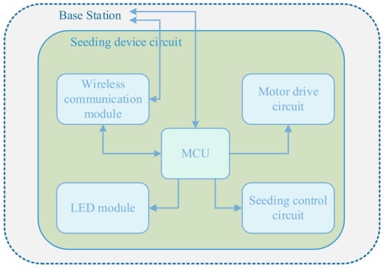 The motor speed control circuit and delay algorithm are used to control the start and stop of the sowing motor and the sowing speed of the sowing machine. Different sowing modes combined with different flight modes can realize one point per plant, one point per many plants, and so on. Single-point sowing and continuous sowing can meet the demands of different seed types and different sowing conditions. Figure 2 shows the electrical component diagram of the seeding emitter control.