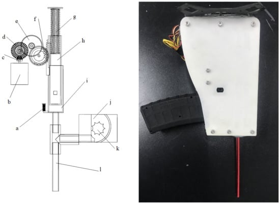 Design of the seed launcher. a. Spring I; b. Accumulator motor; c. Gear I; d. Gear II; e. Gear III; f. Gear IV; g. Spring II; h. Cylinder I; i. Cylinder II; j. Seed storage bin; k. Seed loading motor; l. Launch tube.