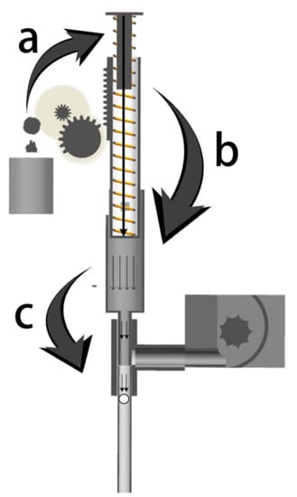 Energy transfer diagram of the seed launcher. a. The electric motor provides power and generates elastic potential energy. b. The elastic force of the spring pushes the cylinder, converting the elastic potential energy into the kinetic energy of compressed air, resulting in gas pressure. c. The gas pressure pushes the seeds out of the launch tube, and the seeds launch kinetic energy.