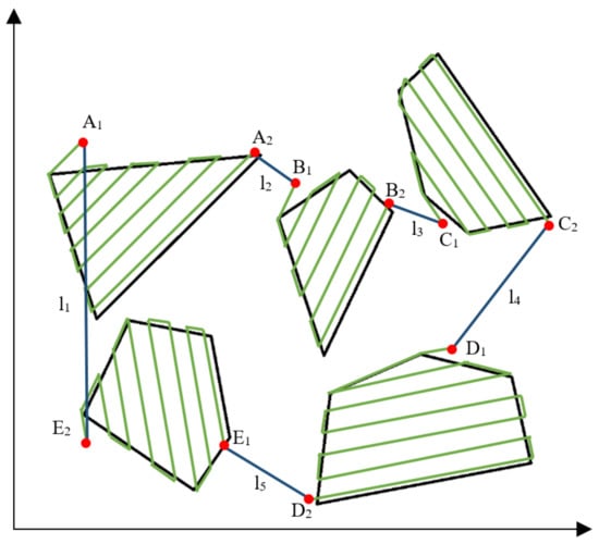 In this paper, the multi-objective optimal route planning method for UAV afforestation is divided into three main processes: first, the optimal route of each single afforestation area is planned; then, the initial node of each afforestation area is obtained; finally, the optimal operation planning among multiple areas is obtained according to the shortest path algorithm. The multi-objective optimal route plan is shown in Figure 5.