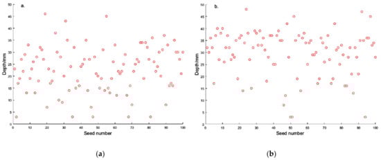 Figure 7a showed the experimental results obtained in soil with a sediment content of less than 20% and an average sowing depth of 3 cm. Figure 7b showed soil with a sediment content of 20–50%, in which the average sowing depth was 2.3 cm. Among the 100 seeds randomly selected, 96 seeds were at depths greater than 1 cm, corresponding to a success rate of 96%. There were six fewer in Figure 7b than in Figure 7a, and the sowing success rate was 90%. As could be seen in Figure 7, the sowing in soils with a sediment content of less than 20% was deeper, the sowing depth distribution was more uniform, and the sowing effect was better. By contrast, the sowing depth distribution in soils with sediment contents of 20–50 was more dispersed. The stability of the sowing depth of this equipment in the soil with 20–50% sediment content was poor, which was related to the content of sand and gravel in the soil. It was difficult to sow in soils with a high sand content because the impact of the seeds on the soil’s sand and stone resulted in a shallow sowing depth. Therefore, greater sowing intensity was needed in soils with high sand content.