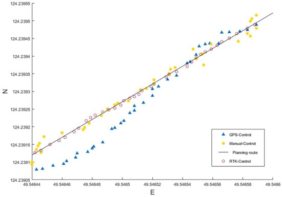 The results showed that the average absolute error of manual control seeding was 47.2 cm. The average absolute error of GPS automatic seeding was 140.8 cm, and the error of RTK automatic seeding was 7.6 cm. As can be seen in Figure 9, when the automatic control seeding mode was used, there was a large distance error between the location of some sown seeds and the preset route. The reason for the large deviation between the seeding position and the preset seeding route was the dynamic GPS positioning signal deviation for the UAV. It could be concluded that a robust positioning system of the UAV was the key to improving seeding accuracy.