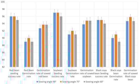 The experiment of tilted seeding was carried out by adjusting the stabilizer of the seeding device. In this study, three sowing experiments were carried out with stabilizer pitch angles of 90°, 75°, and 60°, respectively. Soybean, black bean, and red bean were selected to sow 200 seeds each. The success rates of sowing, germination rates, and germination rates of sown seeds were tested. The comparative experiment results of the three modes of crop sowing were shown in Figure 10.