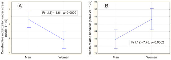 Relationships between selected indicators by gender: (A) level of constructive mobilization under stress, (B) level of health behaviors.
