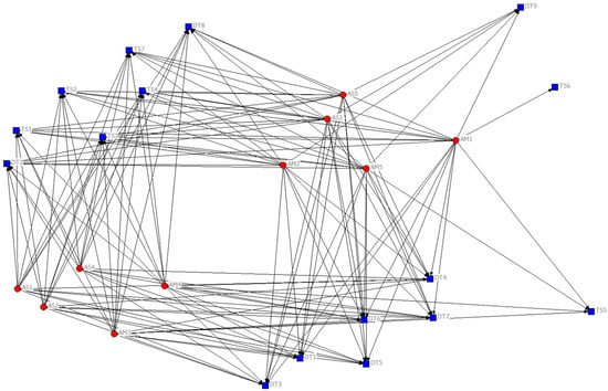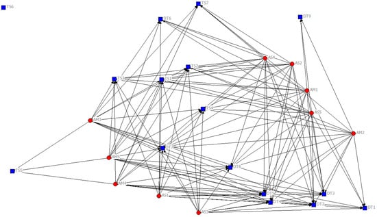 In the graphs, the blue squares represent digital technologies and product-related services. The blue square from AM1 to AM5 represents automotive manufacture, and the blue square from AS1 to AS5 is for automotive suppliers. The red circles represent automotive manufacturers and suppliers. The red circles from DT1 to DT9 represent digital technologies, and the red circles from TS1 to TS7 represent product-related services. The density of the network has a value of 0.788, the network average geodesic distance has a value of 1.667, and the network diameter has a value of 4. Figure 2 shows the automotive network in 2020.