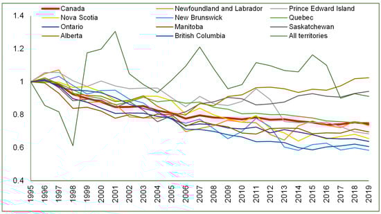 Carbon intensity (GHGs/Energy) (Index 1995 = 1.0). Source: Statistics Canada: Energy is a total energy use final demand in terajoules Table: 25-10-0029-01 while GHGs emissions data are taken from the government of Canada’s Environment and Climate Change Data website.