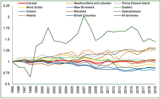 Mixed trends are found in the case of energy use per GDP, but when we compare the energy use per person with the index year 1995, the situation is worse. The energy use per capita is increased compared to the year 1995 in Canada and most of its provinces (see Figure 2). Energy use increased relative to the population as the pace of growth of energy use is higher than the population growth, which means people are using more energy relative to 1995. The slower growth of GDP compared to that of the population in this period confirmed that some provinces, especially Alberta, Saskatchewan, Newfoundland, and Labrador, have energy-inefficient economies.