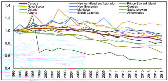 Energy intensity per unit of GDP (Energy/GDP) (Index 1995 = 1.0). Source: Statistics Canada: GDP at 2012 constant prices Table: 36-10-0222-01 and energy is a total energy use final demand in terajoules Table: 25-10-0029-01.