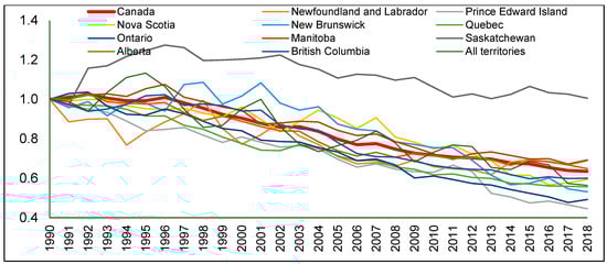 Carbon intensity per GDP (GHGs/GDP) (Index 1990 = 1.0). Source: Statistics Canada: GDP at 2012 constant prices Table: 36-10-0222-01 while GHGs emissions data are taken from the government of Canada’s Environment and Climate Change Data website.