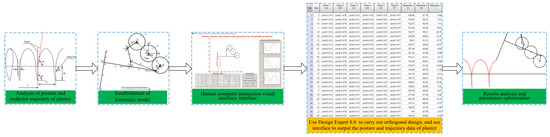 - With the aid of the auxiliary interface and orthogonal design, the combination of parameters that improve the operation performance and quality of the geared five-bar transplanting mechanism for Salvia miltiorrhiza were obtained (l1 = 290 mm, l2 = 100 mm, l3 = 124 mm, l4 = 231 mm, l5 = 64 mm, l6 = 229 mm, l7 = 243 mm, l8 = 100 mm, l9 = 45 mm, θ1 = 45°, θ5–θ2 = 19°, θ7 = 90°, and θ8 = 90°). Compared to before optimization, the optimized h1, β1, and α2 were basically unchanged. The optimized α1 increased approximately 1.9°, while the optimized l reduced by approximately 13.6 mm, which means that the length of the hole formed by the transplanting mechanism was reduced by 13.6 mm.