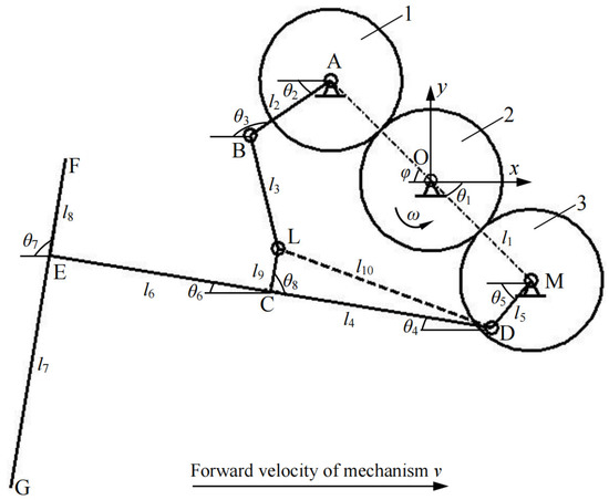 | The Length l2 of Crank AB/mm | The Length l5 of Crank MD/mm | The Difference between Installation Angles θ5–θ2 of Double Cranks/° | The Length l3 of Connecting Rod BC/mm | The Distance l10 between Hinge Point D and L/mm | |