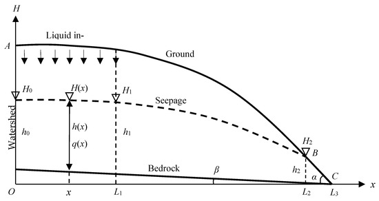 According to Equation (15), under the condition of uniform and steady liquid injection (λ > 0), the seepage line in the injection area is the upper half of the elliptic line, and that in the non-injection area is parabolic. With λ = 0 and L1 = 0 in Equation (15) (i.e., no injection), H0 = H1 = H2 = tan(β)·L3 can be obtained, and the height of the wetted cross-section is h0 = h1 = h2 = 0; that is, no saturation zone is formed above the bedrock surface without liquid injection, which is consistent with the actual situation. When the liquid injection intensity is insufficient, forming a complete seepage line on the bedrock surface is difficult. Therefore, if a complete seepage line is obtained, it should satisfy H0 ≥ tan(β)·L3. By substituting this condition into Equation (15), the minimum injection intensity for a given injection range or the minimum injection range at a given injection intensity can be obtained.