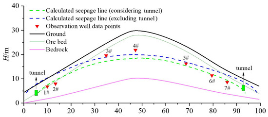 A total of seven liquid-level observation wells were arranged at different locations in Section 2. Table 2 summarizes the spatial coordinates of the observation wells, the observed height value of the steady seepage line at the wells, and the calculated value of the seepage line considering the effect of the tunnel. Figure 3 shows the topography of Section 2, the spatial location of the observation wells, the observed height value of the steady seepage line at the wells, and the calculated curves of the seepage line with and without considering the role of the tunnel.