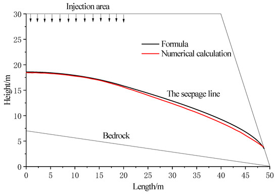 Under the typical working condition (α = 71.57°, β = 7.97°, L1/L3 = 0.4, λ = 0.12), the comparative analysis of the seepage line is shown in Figure 4. It can be seen that the seepage line calculated by the equation is slightly higher than that obtained by numerical calculation, and they are very close. The calculation error gradually increases along the flow field direction, i.e., the error in the liquid injection section is the smallest, followed by that in the intermediate section, and the error in the seepage section (near the seepage point) is the largest. However, the seepage line calculated by the equation is lower than that obtained from numerical calculation at the seepage point. The reasons are as follows: In this paper, the Dupuit assumption was introduced during the derivation of the seepage line equation. However, near the subsurface watershed and seepage point, the Dupuit assumption cannot be satisfied [28]. Near the watershed, the vertical velocity is large; the vertical plane is very close to the stream surface and therefore cannot be assumed to be an equipotential surface. The Dupuit assumption ignores the vertical velocity so that the value calculated by the equation is larger than the actual value. At the seepage section, the equipotential surface is often curved, and the hydraulic gradient gradually becomes large to facilitate the seepage of groundwater into surface water. Subsequently, the “water jump” phenomenon occurs. However, the Dupuit assumption cannot consider the “water jump” phenomenon. In addition, the seepage line equation at the seepage point meets the condition that the seepage line is tangent to the seepage slope, causing a serious “bending” of the seepage line at this point. Therefore, the value calculated by the equation is smaller than the actual value.