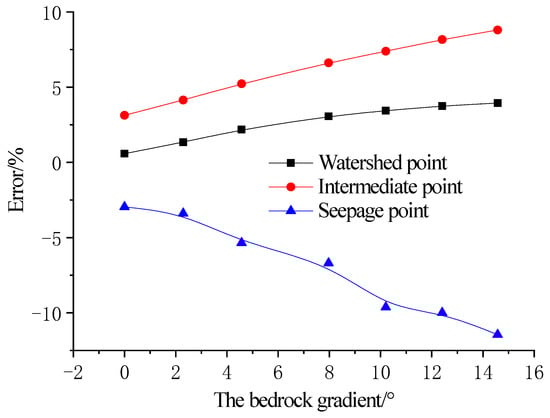 The variation curve of the calculation error of the seepage line with the bedrock gradient is shown in Figure 6. It can be seen that the calculated value of the seepage line is larger than the theoretical value at the watershed and intermediate point and smaller than the theoretical value at the seepage point. The absolute value of the error increases approximately linearly with the increase of the bedrock gradient. The error arises because the influence of the bedrock gradient is ignored in the calculation of the hydraulic gradient in the seepage line equation in this paper, and the horizontal distance is used to approximate the infiltration length. Since the bedrock gradient of ISL is generally small (β < 15°), the effect of the bedrock gradient on the calculation error of the seepage line is small.