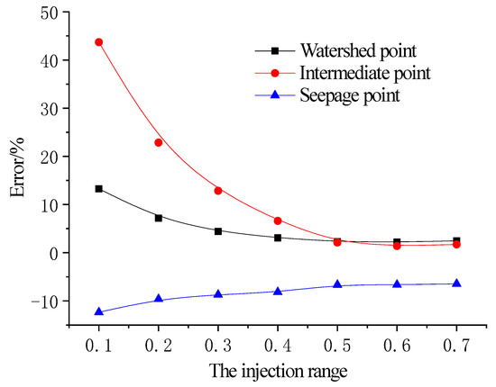 The variation curves of the calculation error of the seepage line with the fluid injection range and the relative permeability coefficient are shown in Figure 7 and Figure 8, respectively. It is shown that the change in the calculation error of the seepage line with the injection range has a similar pattern to the change with the relative permeability coefficient. Specifically, the absolute value of the error decreases as the injection range or relative permeability coefficient increases. The relative liquid injection intensity Wr was defined as the ratio of the actual injection flow rate of the mine to the saturation injection flow rate for the total area of the mine, i.e., Wr = λ·L1/L3. Figure 7 and Figure 8 show the change law of the calculation error of the seepage line equation with Wr. When Wr is very small, a complete seepage line cannot be formed on the bedrock of the mine. At this time, the seepage line calculation error is large, which only occurs in the early phase of ISL. In the steady phase, Wr is large, a high seepage line is formed on the mine bedrock, and calculation error is reduced to an acceptable range.