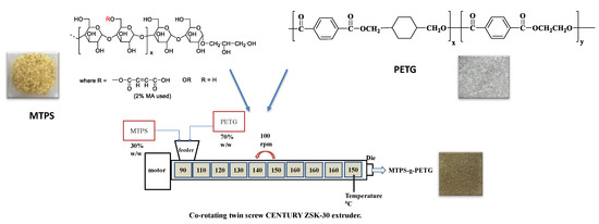 - Raquez, J.M.; Nabar, Y.; Srinivasan, M.; Shin, B.; Narayan, R.; Dubois, P. Maleated thermoplastic starch by reactive extrusion. Carbohydr. Polym. 2008, 74, 159–169. [Google Scholar] [CrossRef]