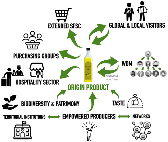 This case study of the Mediterranean extra virgin olive oil value chain aims to contribute empirical evidence to incorporating the agrobiodiversity concept within mechanisms for value enhancement of origin products, within sustainable local value chains, via building a community around products. The tools and mechanisms for market competitiveness and product differentiation of quality origin products are illustrated, contributing to food systems’ transition towards sustainable development. Our analysis provides three stages of community building around the sustainable, local product: (1) The product positioning phase: all the activities chosen by the producer for the agricultural production, processing, and marketing for value enhancement; all the activities performed before the consumer encounters the product. (2) The consumer attraction phase: the moment when the consumer becomes familiarized with the product; the phase where the institutional capital plays an important role, as often the producers enter markets supported by different groups, networks, or institutions with which they partner. (3) Communities of value co-creation: the final stage of consumer engagement with the product. Communities of value connecting individuals through similar values of sustainability, agrobiodiversity, defending and respecting the environment, and tasty, nutritious food, are substantial components for the transition towards more sustainable origin food systems.