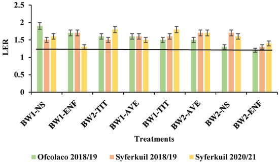 The productivity of intercropping (LER) ranged from 1.2 to 1.9 at Ofcolaco (Figure 1). Among the intercrops at Syferkuil, BW2-NS treatment had the highest biomass accumulation of 2217.3 kg ha−1 in the 2018/19 growing season. In the 2020/21 growing season, BW2-Sole and BW2-TIT accumulated highs of 3566.0 kg ha−1 and 2877.8 kg ha−1, respectively. The LER ranged from 1.3 to 1.7 in the 2018/19 and 1.3 to 1.8 in the 2020/21 growing seasons (Figure 1).