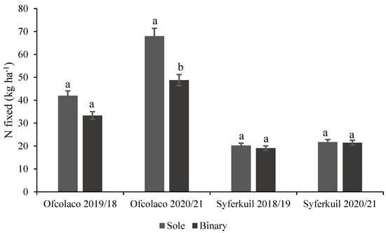 Figure 2. Nitrogen fixation in cowpea sole and binary cultures across cowpea density and sorghum cultivar at Ofcolaco and Syferkuil during the 2018/19 and 2020/21 cropping seasons. Different letters mean significant differences at p ≤ 0.05.
