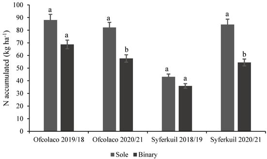 Figure 3. Nitrogen accumulation in cowpea sole and binary cultures across cowpea density and sorghum cultivar at Ofcolaco and Syferkuil during the 2020/21 cropping season. Different letters mean significant differences at p ≤ 0.05.